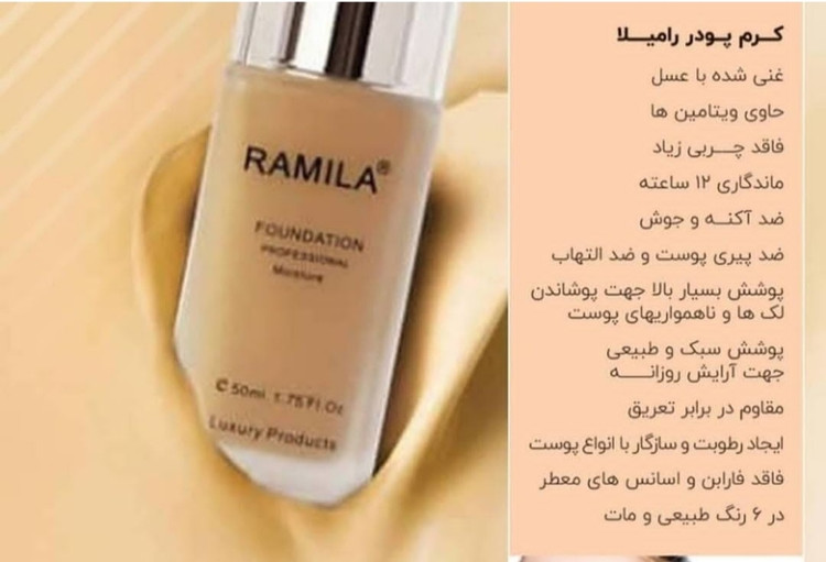 کرم پودر رامیلا دررنگ بندی های مختلف با مواد اولیه کشور ایتالیا یکی از محصولات حرفه ای و با کیفیت موجود در بازار محسوب می شود که با پوشانندگی بالا بر روی پوست برای انواع پوست مناسب است و نبود چربی زیاد در این کرم باعث شده است که بدون احساس چربی بر روی پوست و با رنگی طبیعی روی پوست شما بماند و در برابر تعریق مقاوم باشد. از طرفی کیفیت بالای مواد به کار رفته در این کرم پودر از بروز آکنه و جوش جلوگیری می کند علاوه بر این با آبرسانی قوی و ایجاد رطوبت در سطح پوست، شادابی و شفافیت پوست صورت شما را دو چندان می کند. در واقع کرم پودر رامیلا غنی شده با عسل و مواد معدنی می باشد که باعث خاصیت ضدپیری و ضد التهاب پوست می شود و با ماندگاری 12 ساعته و کاور بسیار بالا، پوشاننده لک ها، قرمزی و ناهمواری های پوست بوده که بافت سبک و طبیعی آن بسیار مناسب جهت آرایش روزانه بوده. همچنین به دلیل توجه به سلامت مصرف کننده و برخورداری از فرمولاسیون پیشرفته حاوی ویتامین ها و فاقد پارابن و اسانس های معطر است.